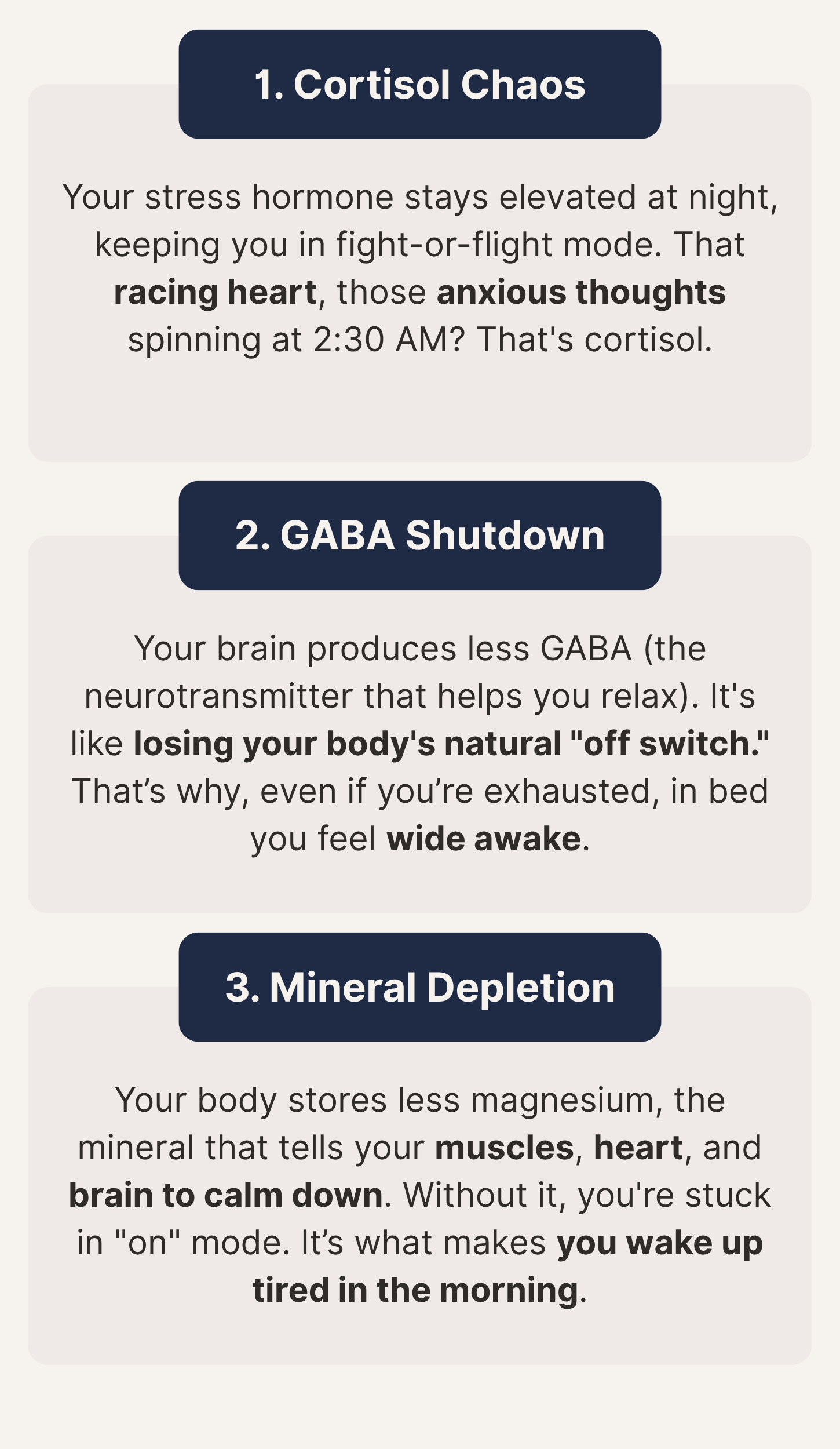MenoRest is specifically catered for women in perimenopause and menopause. Unlike generic sleep aids or pills, we address the root causes of your sleep disruption with ingredients that support both sleep quality and mineral balance.
